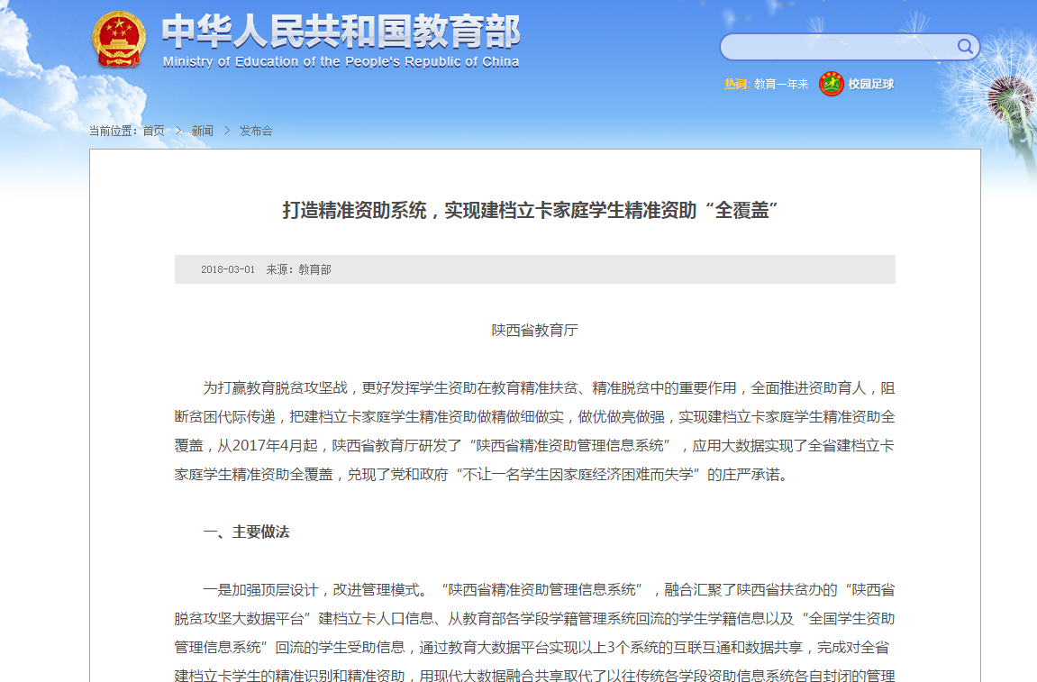 教育部網站(zhàn)報(bào)道(dào)陝西(xī)教育精準資助經驗和±∞₩(hé)精準資助大(dà)數(shù)據系統優秀案例,該系統由陝西(xī)凱銳公司開(kāi)發!♣β✔陝西(xī)省教育廳以全國(guó)教育系統資助工(€₩gōng)作(zuò)示範單位的(de)身(shēn)份,出席了(le)此次新聞發布會(huì‍εΩ),并面向全國(guó)新聞媒體(tǐ)宣傳陝西(xī)教育精準扶貧₽∏♦​取得(de)的(de)成績。
